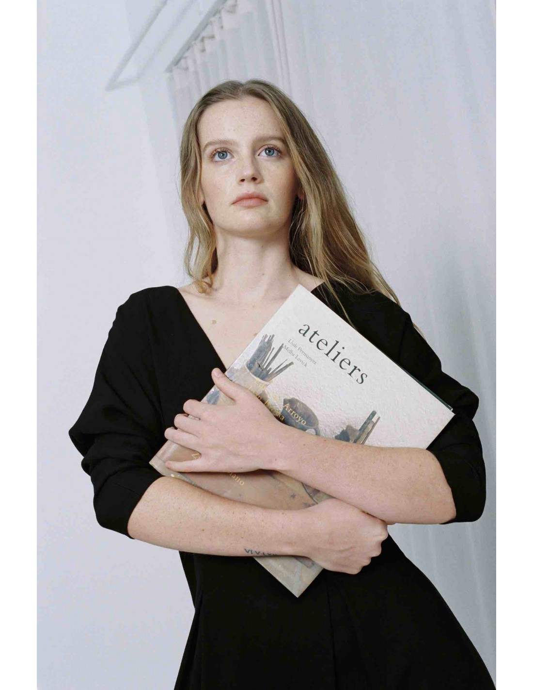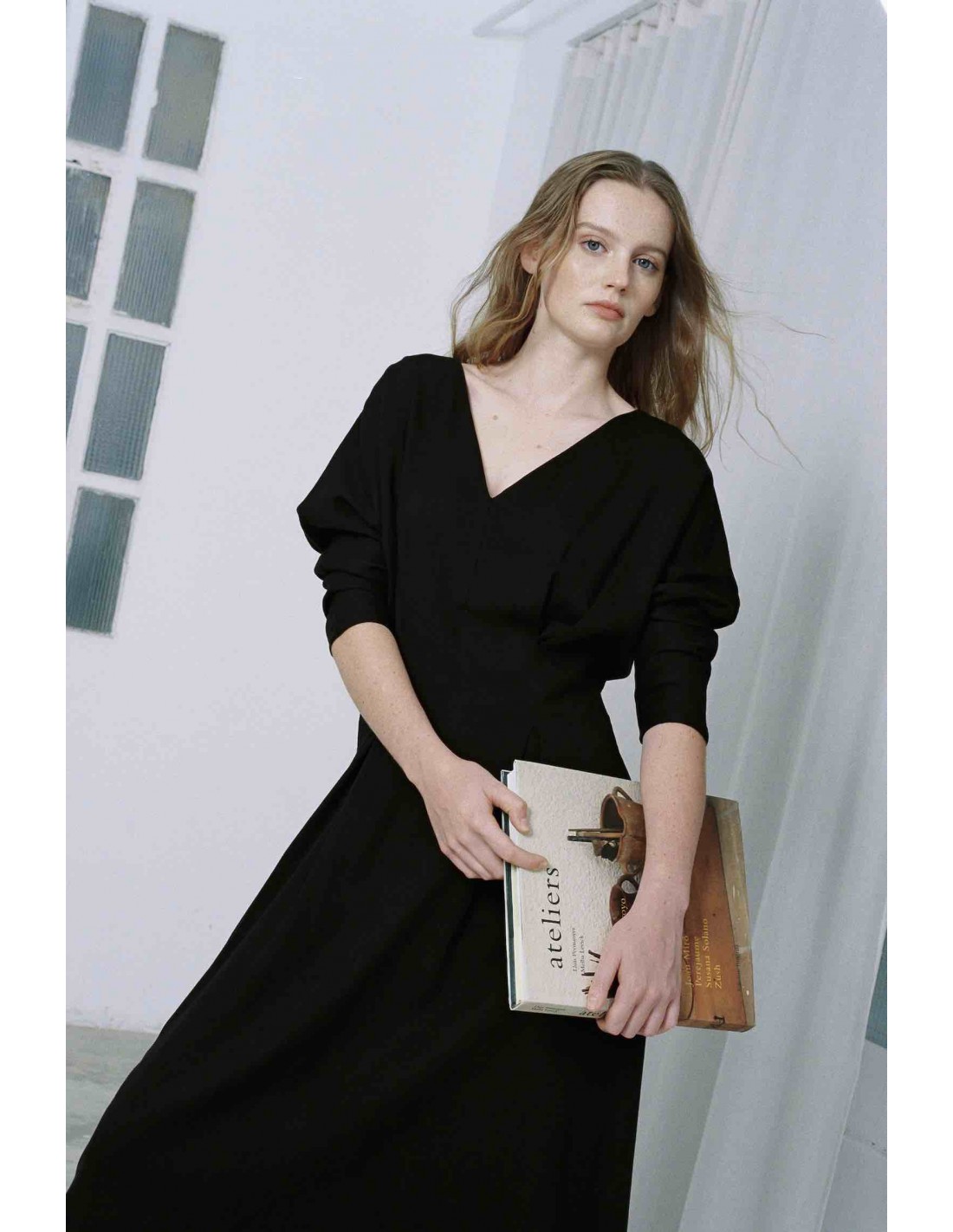 Vestido estampado fluido, con escote pronunciado, pinzas y manga japonesa.