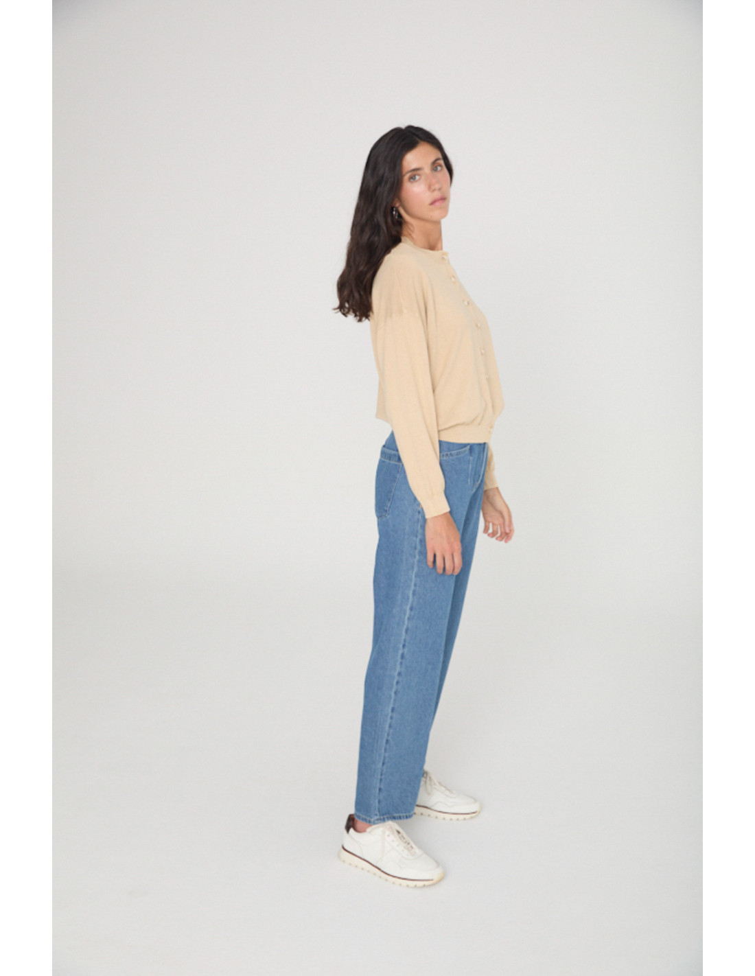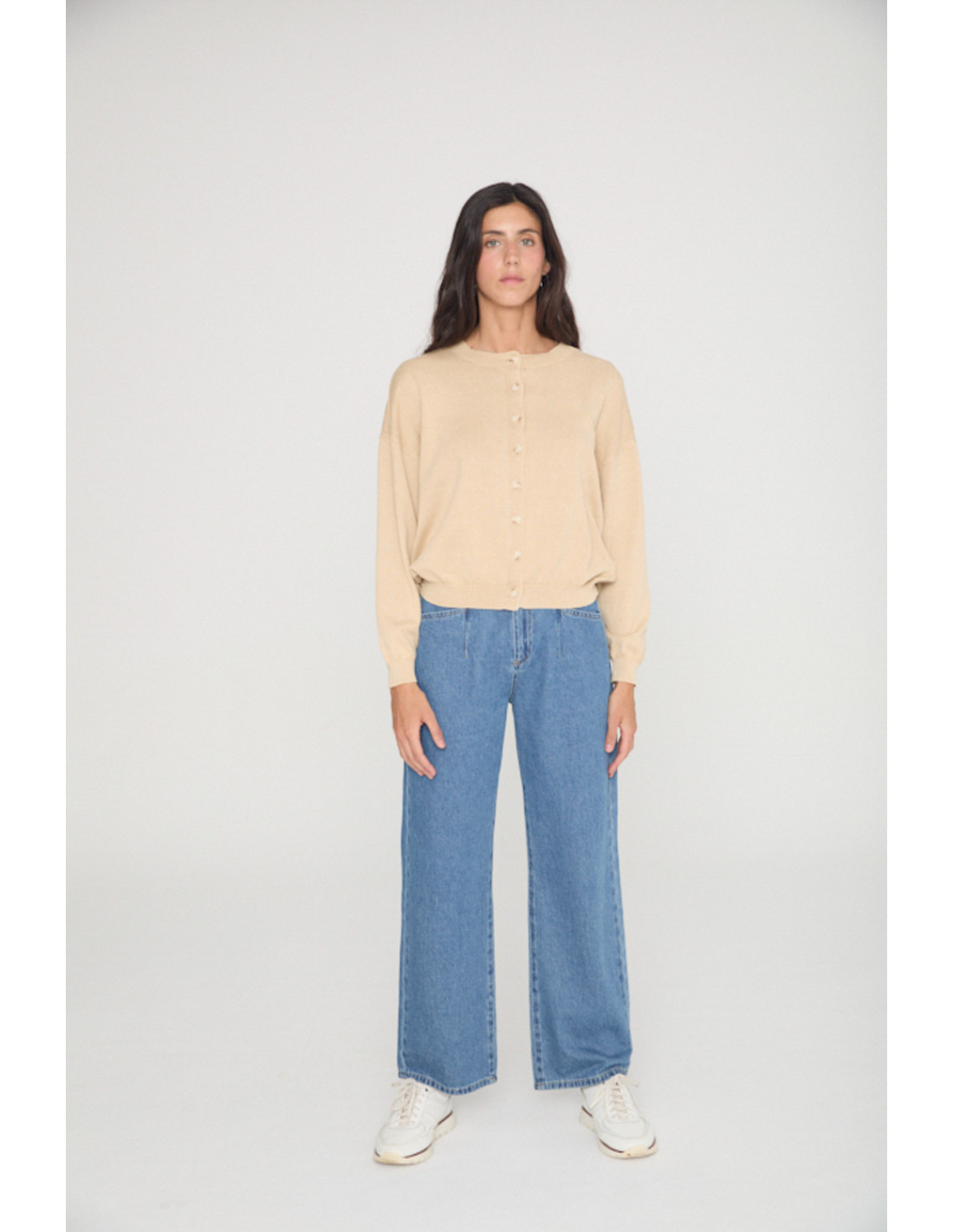 Tricot cardigan with round neck and button fastening in the centre. Stone washed effect fabric, ribbed collar, hem and cuffs.