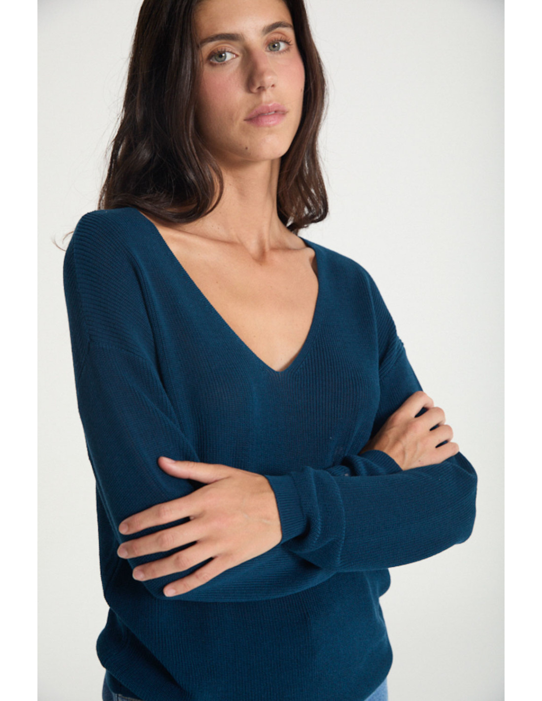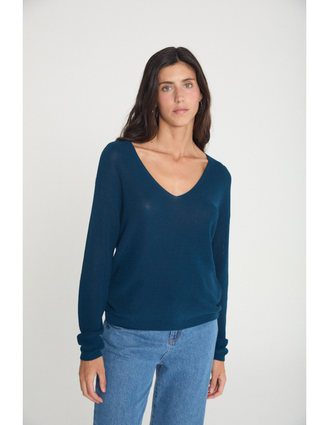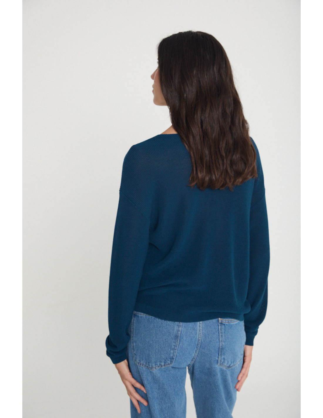Basic tricot jumper with V-neck, long sleeves and dropped shoulder.